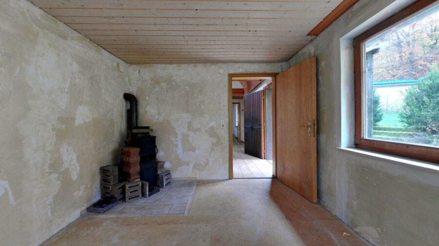 Auf einem großzügigen Grundstück von etwa 2.200 m² gelegen, umgibt das Haus ein Gartenreich, das zur naturnahen Gestaltung und Nutzung einlädt. Die Wohnfläche von circa 150 m² verteilt sich auf fünf lichtdurchflutete Zimmer, wobei eine Einbauküche und ein Badezimmer vorhanden sind. Auch eine Terrasse (direkt vor dem Hauseingang) gehört zur Ausstattung, die an schönen Tagen zu erholsamen Stunden im Freien verführt. Im Wohnbereich befindet sich ein Specksteinofen, welcher im Winter zusätzlich für eine angenehme Wärme sorgt. Als Hauptheizung wurde eine Gasheizung mit einem gemieteten Flüssiggastank installiert. Zum Teil wurde eine Sanierung bereits begonnen, welche allerdings nicht weit gediegen ist. So wurde im Keller eine Decke zum Teil schon mit Hanfwolle gedämmt und die Wände zwecks Trocknung mot entsprechenden Bohrungen versehen.