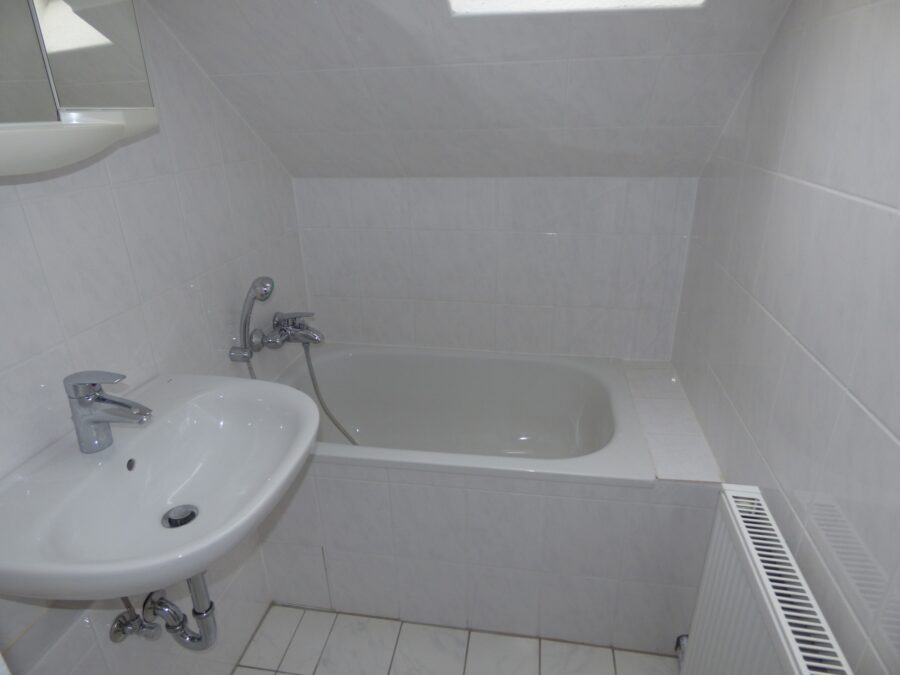 Das Tageslichtbad verfügt über eine Sitzbadewanne, das WC befindet sich, getrennt vom Badezimmer, in einem separaten Raum gleich nebenan.