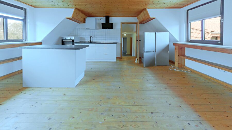 Auf einer großzügigen Wohnfläche von ca. 93 m² erstrecken sich drei gut geschnittene Zimmer. Das Herzstück der Wohnung bildet eine moderne, offene Wohnküche mit Einbauküche, die perfekt für gemeinsames Kochen und gemütliche Stunden mit der Familie oder Freunden ist.